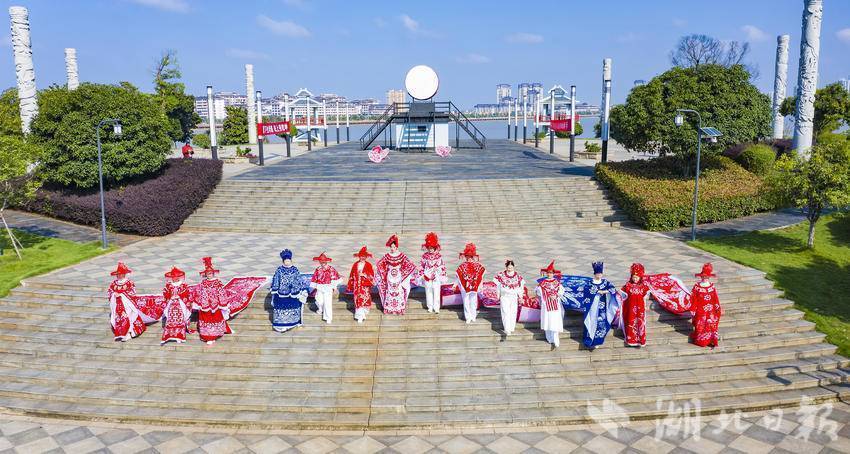 一纸一剪,千年技艺化身流动的艺术。“龙袍起,风云动!”随着非遗传承人手中的金剪轻启,模特身着剪纸华服,款款走向雄风鼓台楼。模特身着3米余长的“龙纹剪纸长袍”拾级而上。蓝色的龙袍以龙与长城为创意,象征着中华民族的坚韧与腾飞。作品通过镂空技法将鳞片、云纹层层叠叠,行走间光影流转,仿佛将流动的史诗穿在身上。而与之呼应的红色“凤冠霞帔”则以嘉鱼二乔公园双凤楼为灵感,表达了嘉鱼人民对幸福美满生活的向往。作品以凤凰展翅的剪影与流苏相映,羽翼舒展,姿态优雅,暗喻“凤凰于飞”的祥瑞,引得游客纷纷举起手机记录。